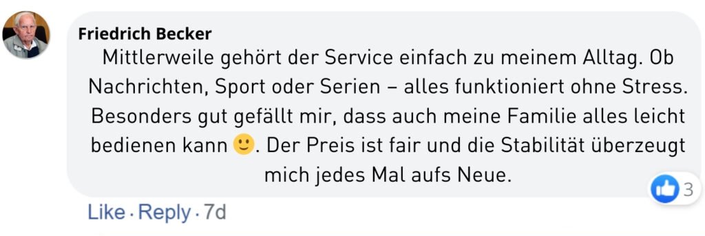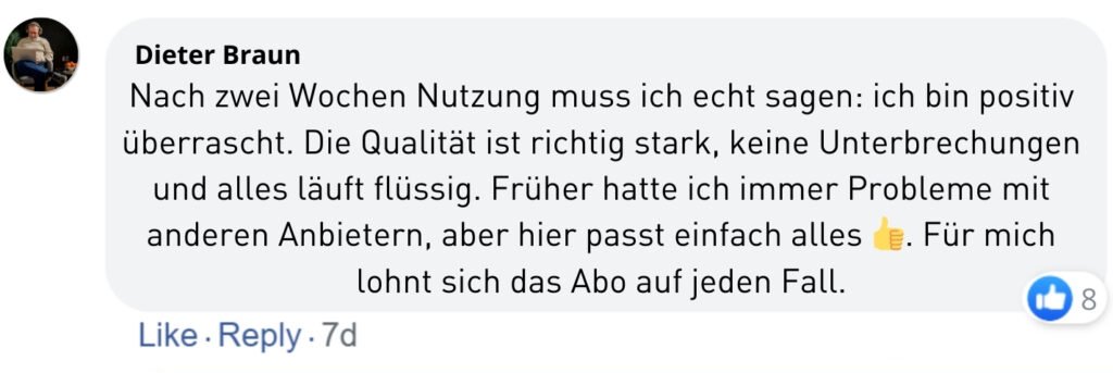 Wenn Ihre Download-Geschwindigkeit nicht weniger als 20 Mbps beträgt, funktioniert alles reibungslos in höchster Qualität. Wenn Sie unsicher sind, fordern Sie einen 1-tägigen Test an, um die Qualität zuerst zu überprüfen